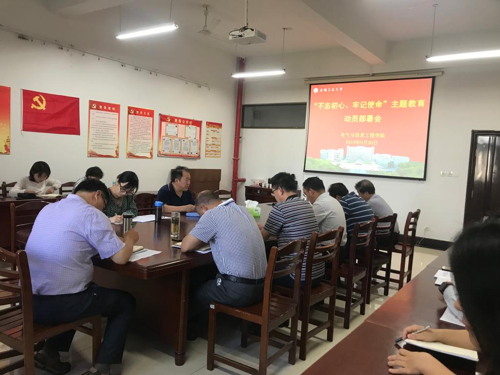 9月20日上午,电气博彩 党委召开“不忘初心、牢记使命”主题教育动员部署会。校党委主题教育督导组第四督导工作组到会指导。博彩 党政领导、党委委员、党支部书记、系室中心主任、科级干部、工会主席和全体辅导员参加会议。会议由院党委书记叶凤华主持。