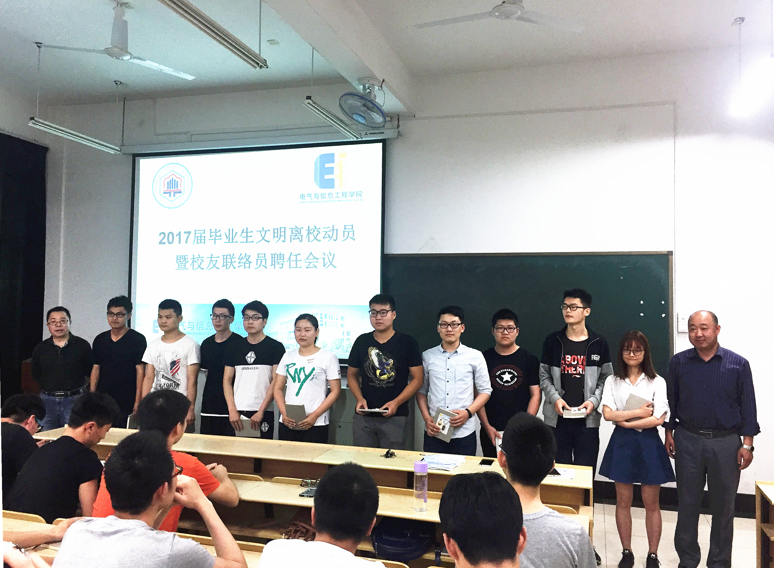 在电气楼114教室召开2017届毕业生文明离校动员暨校友联络员聘任会议。院党委副书记、副院长郭宏,副院长聂建华,团委书记孔洋波,2017届辅导员张敏、盛樟,毕业班党员、班干、校友联络员、考研优秀学生代表参加了会议。会议由张敏主持。