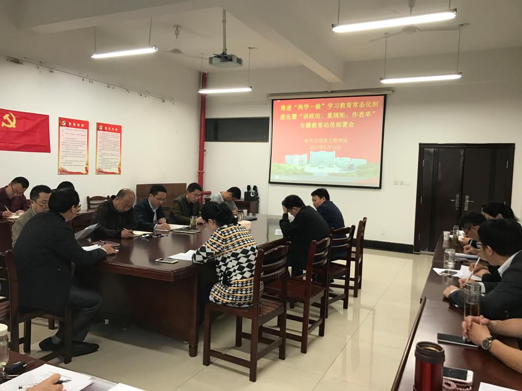 5月12日上午,电气与信息工程博彩 在电气楼304会议室召开党委中心组理论学习(扩大)会,就认真推进两学一做学习教育常态化制度化“讲治、重规矩、作表率专题教育工作作动员部署。院党委中心组成员、各系室中心主任参加会议。会议由院党委书记叶凤华主持。