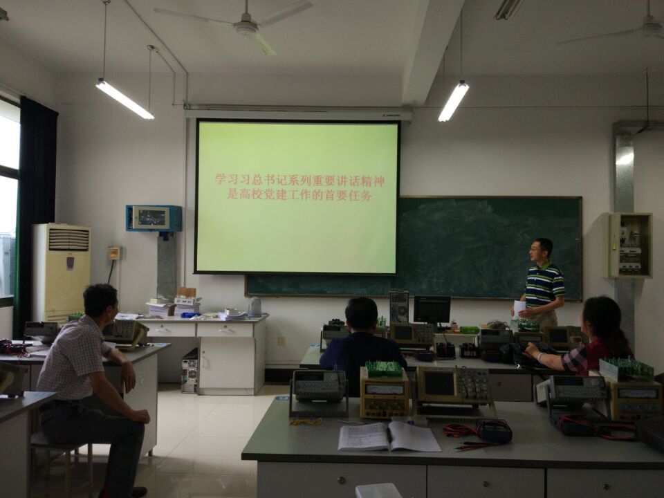 6月5日上午,为推进“两学一做”学习教育常态化制度化,普通党员教师冯旭刚在实验中心党支部讲党课,党课内容主要围绕“学习习总书记系列重要讲话精神是高校党建工作的首要任务”深入展开来。实验中心全体党员都参加了此次学习活动。