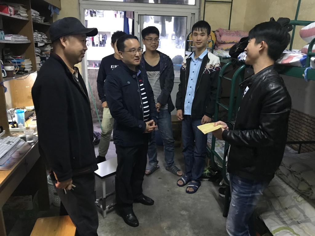 领导就亲切的慰问王唱和李俊杰最近的生活和学习安排。在交谈中,得知王唱同学利用课余时间在大学生就业指导中心勤工助学,叶凤华为他竖起来大拇指,鼓励他多锻炼,在提升学习能力的基础上要兼顾品格的磨练和才干的增长。李俊杰同学现在已经大四,正在宿舍修改简历,党委副书记副院长郭宏轻轻地拍着他的肩膀,指导他稍作调整。他告诉博彩