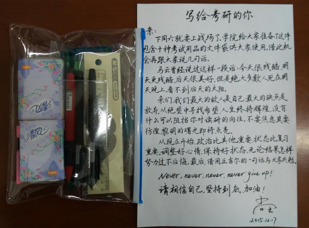 给每一位考研的学生准备了考研文具,并且附了一封勉励信。当晚,辅导员尚全老师在其QQ上写了一篇日志,给学生分析讲解了最后阶段的复习方案和答题技巧。当晚阅读量过1200,点赞超过400,被多家媒体转载,具体如下: