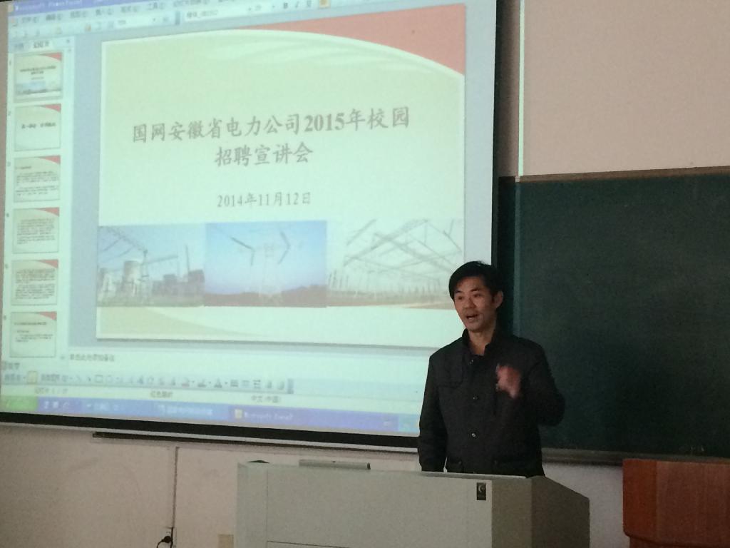 11月12日下午,马鞍山市供电公司在电气楼114室开展2015校园招聘宣讲。宣讲会由马鞍山市供电公司人力资源部主管戴德清主讲。博彩