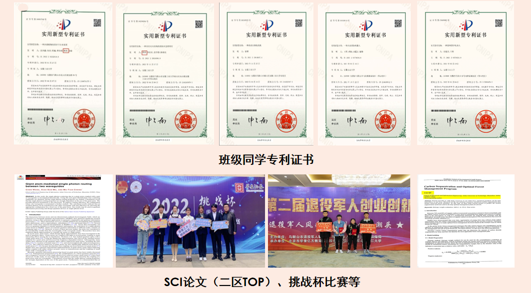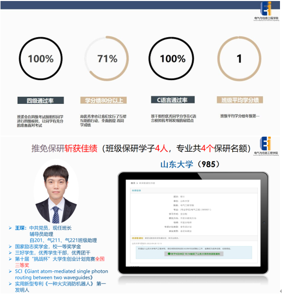 班级中最高。班级同学发表SCI论文两篇,其中1篇为SCI二区TOP,申请专利5项,在科技竞赛共获国家级奖项3项,省级奖项11项,班级同学主持国创项目2项,省创项目8项。班级四级通过率100%,C语言省二级通过率100%,今年,专业推免名额共4个,4个名额全部花落该班。