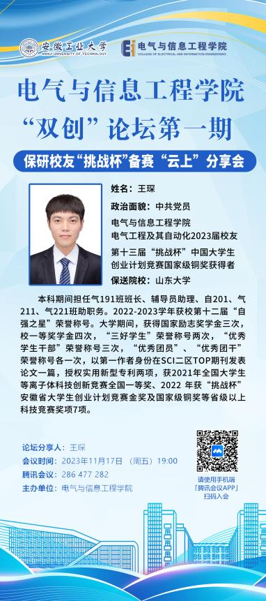 23届保研学子,第十七届“挑战杯”国家级铜奖获得者王琛校友为电气学子分享“挑战杯”竞赛的备赛经验。