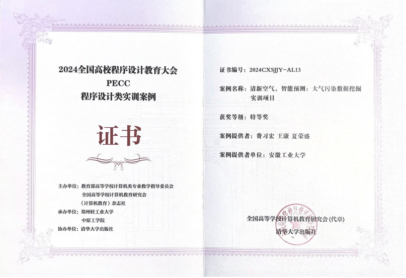 教师费习宏、王康、夏荣盛老师撰写的《清新空气,智能预测:大气污染数据挖掘实训项目》荣获“程序设计类实训案例”特等奖。王康、费习宏和汪婧老师撰写的《学海启航:一站式班级网络中心》荣获“程序设计类实训案例”二等奖。