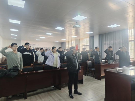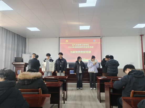 党委关于党员发展和转正的批复,并向新党员们表示祝贺,要求全体党员在今后的专业学习、社会实践和创新创业等各项工作中牢记党员身份,切实履行党员职责,勇当先锋充分发挥模范带头作用。丁忠利、李克明向新加入党组织的党员同志们佩戴党员党徽。宣誓环节上,全体新老党员起立,面向鲜红的党旗,在领誓人带领下,举起右拳,庄严宣誓,宣誓声铿锵有力,展现同志们坚定的理想信念和为党的事业奋斗终生的坚定决心。在专题党课环节上,丁忠利围绕党的二十届三中全会的丰富内容和重大意义等方面,分别从党的改革开放历程、全面深化改革的重大意义、三中全会报告的丰富内涵、大学生贯彻落实全会精神的具体实践路径等方面作了阐述与讲解;同学们听后纷纷表示对全会精神有了更深入的理解和把握,对未来大学里的努力方向有了更强劲的动力,在今后的专业学习、社会实践、班级管理、同学帮扶等方面将持续努力,以更加坚定的信念、更加务实的作风、更加有为的成绩,展示新时代学生党员的新作为和新形象。