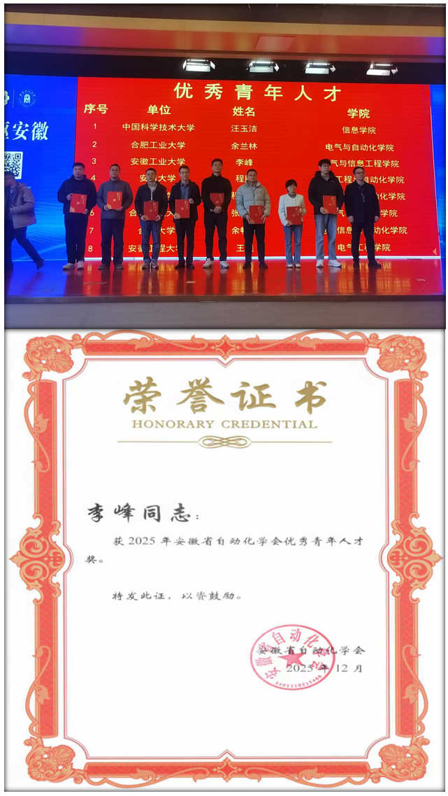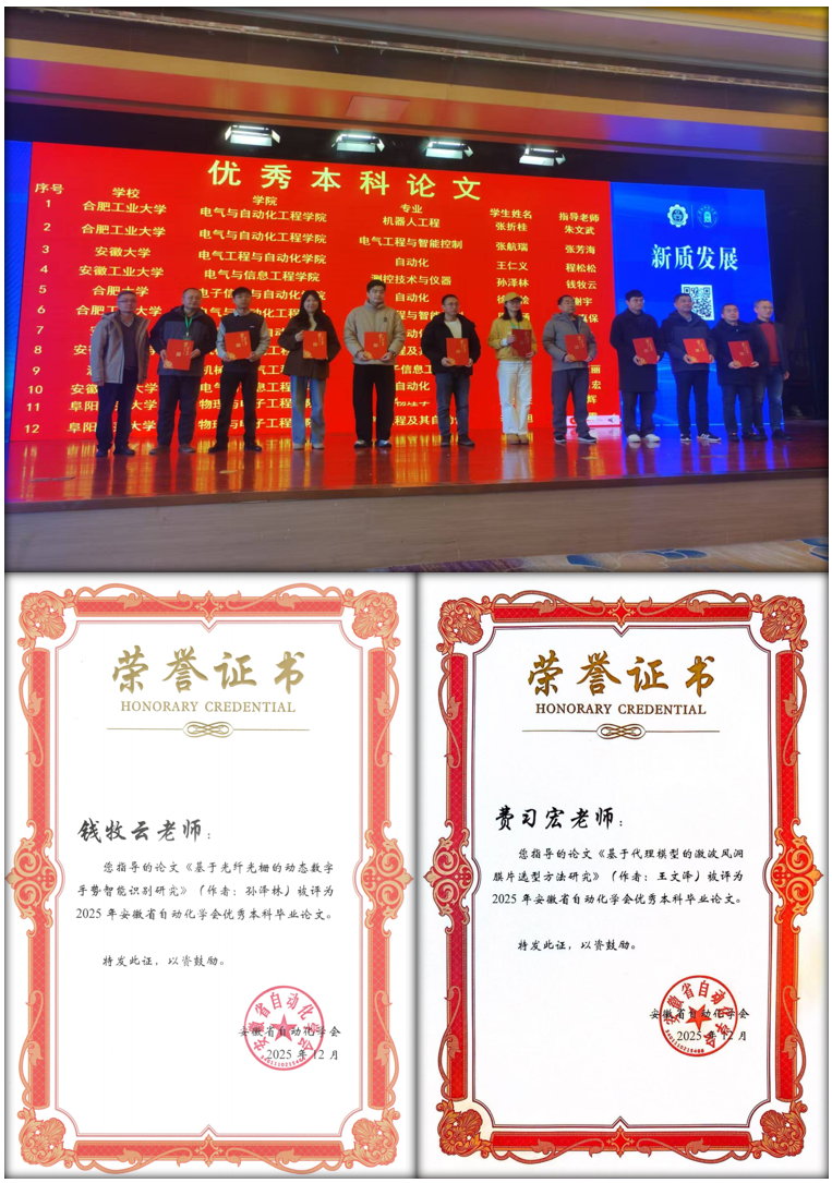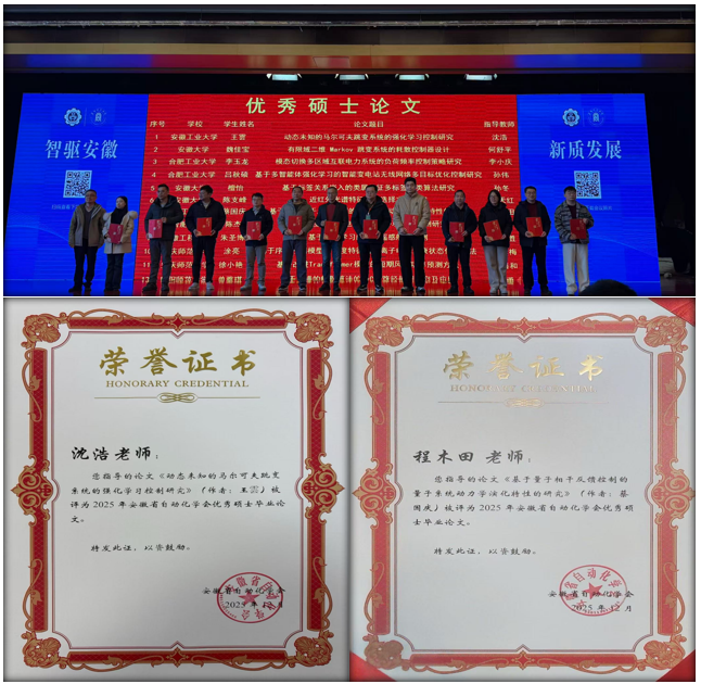 会上发布了2025年度安徽高校自动化专业教育领域的多项奖项,博彩 喜获安徽省自动化学会优秀硕士毕业论文奖、优秀本科毕业论文奖以及优秀青年人才奖。其中,硕士研究生王雲撰写的《动态未知的马尔科夫跳变系统的强化学习控制研究》(指导教师:沈浩)和蔡国庆撰写的《基于量子相干反馈控制的量子系统动力学演化特性的研究》(指导教师:程木田)获得优秀硕士毕业论文奖;本科生王文泽撰写的《基于代理模型的激波风洞膜片选型方法研究》(指导教师:费习宏)和孙泽林撰写的《基于光纤光栅的动态数字手势智能识别研究》(指导教师:钱牧云)获得优秀本科毕业论文奖;博彩 青年教师李峰获得安徽省自动化学会优秀青年人才奖。