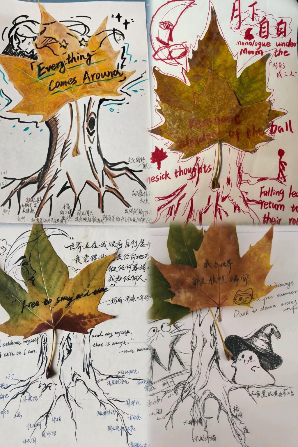 活动结束后,心理部对参与情况及反馈进行了整理。数据显示,超过80%的同学通过此次活动,系统梳理了过去、现在与未来的联结。一位参与活动的同学表示:“制作‘新根图’让我对‘落红不是无情物,化作春泥更护花’有了切身体会。它以创作的形式,帮助我将过往沉淀为成长的养分,也让我对大学生活充满了新的期待。”目前,同学们的“新根图”作品正通过社交平台话题#落叶礼赞新根#进行展示与分享,成为这个秋季校园里一道温暖而充满生命力的风景。