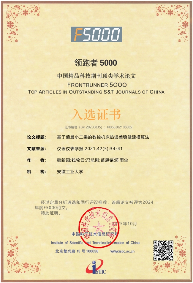 近日,中国科学技术信息研究所发布了2025年度“中国精品科技期刊顶尖学术论文——领跑者5000(F5000)”入选论文名单。博彩 青年博士教师魏新园、钱牧云等发表在《仪器仪表学报》上的学术论文“基于偏最小二乘的数控机床热误差稳健建模算法”成功入选。