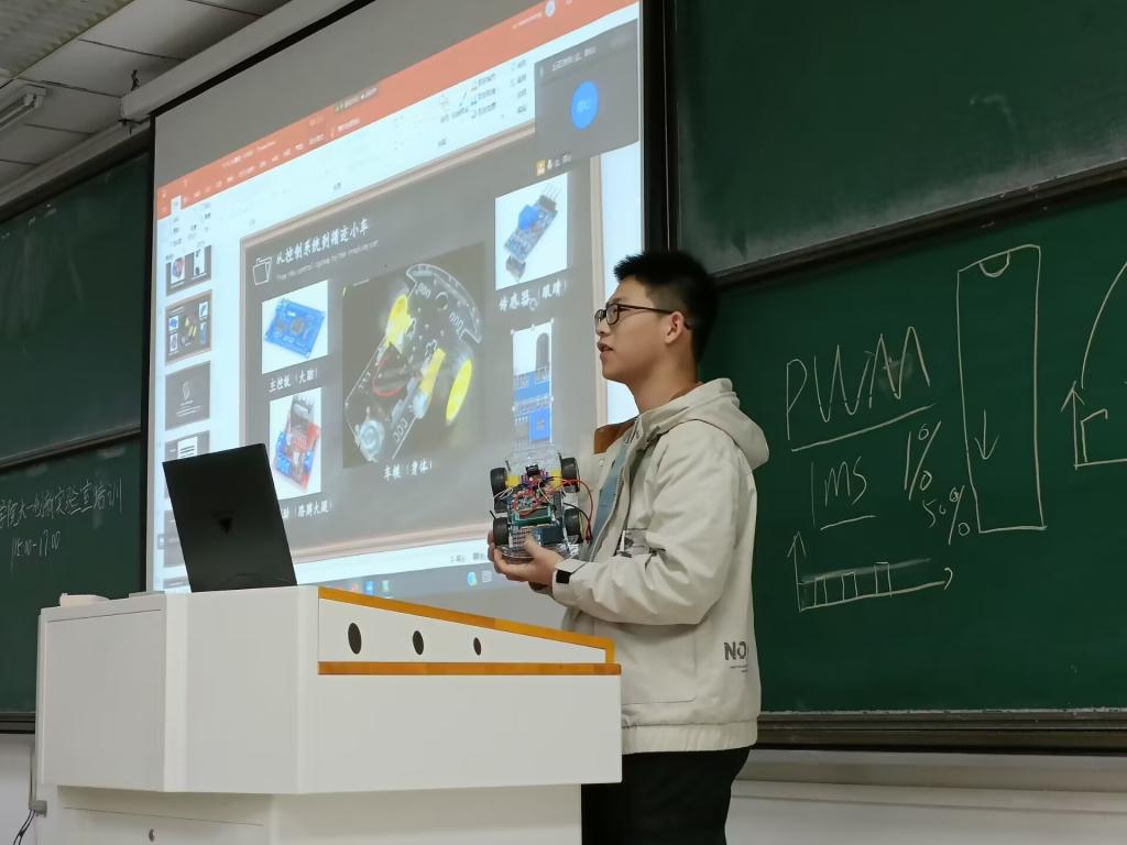 培训过程中,许文长结合自身的学习经历和参赛经验,生动的阐述了51单片机的基础知识、工作原理及其实际应用,并以智能小车为载体,详细介绍了51单片机在智能小车上的作用、循迹小车的循迹原理等竞赛基础知识。同学们兴趣浓厚,纷纷上台与学长们展开交流和讨论,并近距离观察智能小车,领略单片机在智能小车上的具体应用。