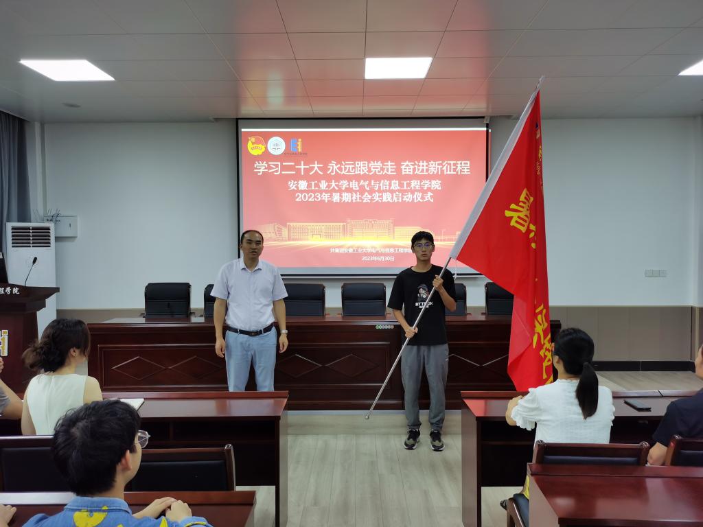 2023年暑期社会实践组队情况,并就实践安排、目标要求、安全注意事项等方面进行了详细的讲解。夏玉钦为社会实践队代表授旗,并鼓励同学们积极深入基层,在实践中了解国情,在克服困难中锤炼自我,自觉做到严守纪律、服从指挥,增强自我保护意识,确保实践活动安全顺利开展。最后,现场就活动稿件撰写、照片视频拍摄、稿件投稿、安全教育等方面做专题培训。