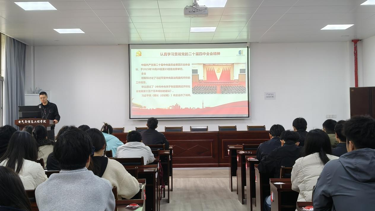 学生测控党支部与学生电气工程党支部在电气楼113教室联合开展学习贯彻党的二十届四中全会精神专题党课。本次党课由学生电气工程党支部书记蒋安东主持,学生测控党支部书记杨恒基主讲,两个支部全体党员参加学习。