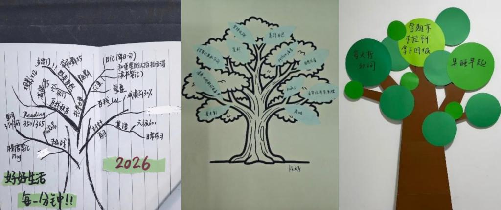 活动中,同学们用卡纸剪出属于自己的“大树”轮廓,并在树干上写下人生发展大方向,如“职业规划”“考研深造”“创新创业”等,以此在就业安心计划框架下精准锚定成长坐标。随后,大家用软陶泥或彩纸制作“小新芽”,在每个新芽上标注具体行动步骤,如“每周阅读一篇专业前沿论文”“参加行业分享会”“每天坚持英语听力练习”等。这些微行动正是学业护心计划中时间管理理念的延伸,将抽象目标转化为每日可积累的学业行为。最后,“新芽”被粘贴在树枝上,形成一棵棵独一无二的“成长之树”。